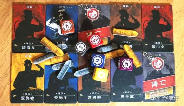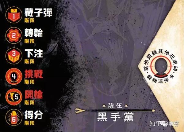 游戏分为上图所示的6个环节,每个人游戏初始阶段有6张空响卡和1张子弹卡,还有1张行动卡,同时还有一名队长板和三名队员板,代表着自己拥有4条命。