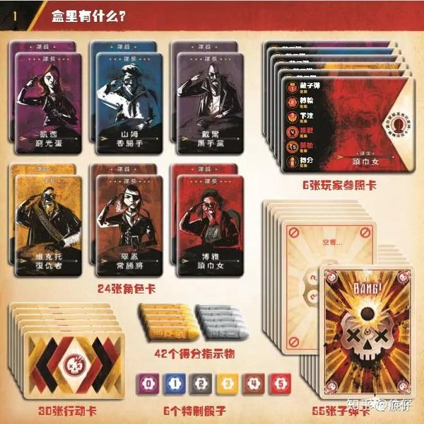 简单来说游戏中每名玩家选择一张卡牌暗置在自己的玩家板下,藏牌,然后将剩余的6张牌洗匀,随后所有玩家同时用各自的骰子下注,赌自己本回合开几枪仍旧能活命。